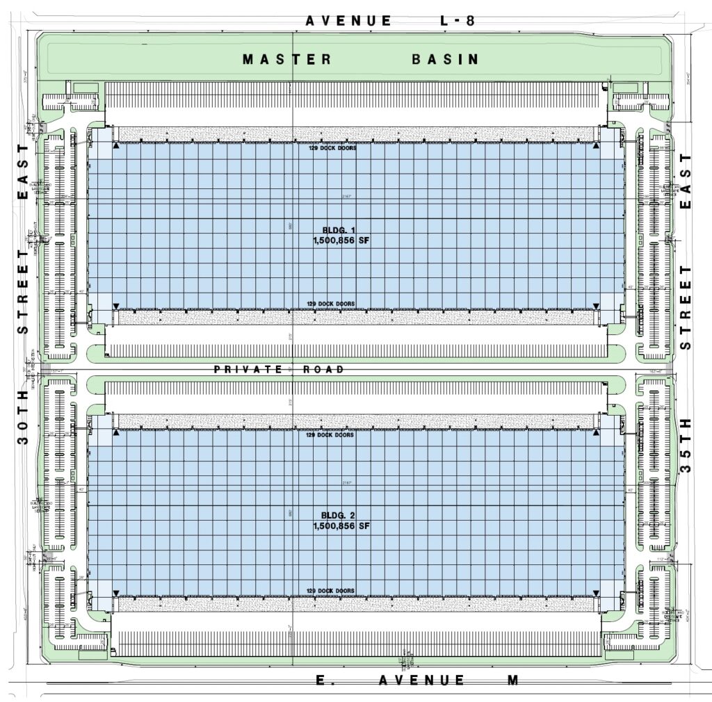 The project features two state-of-the-art industrial warehouse buildings, each approximately 1,500,856 square feet, for a combined total of over 3 million square feet, along with an 11-acre stormwater detention basin on a third parcel.