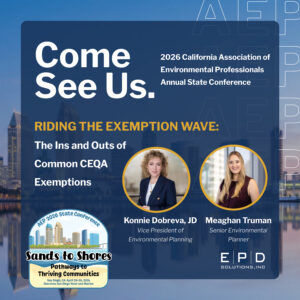 EPD Solutions is proud to be presenting at the 2026 California Association of Environmental Professionals (AEP) Annual State Conference — Sands to Shores: Pathways to Thriving Communities — April 23–26 at the Sheraton San Diego Hotel & Marina.